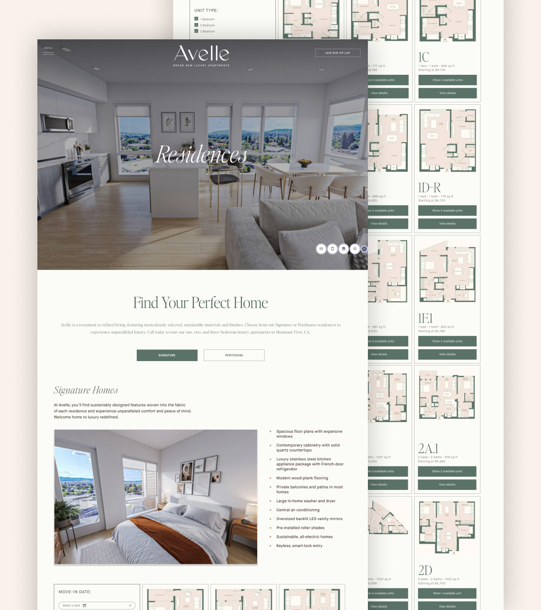 By incorporating clear menus and strategically placed calls-to-action, we guided users effortlessly through the site, making it simple to access key information or schedule a tour. This approach not only enhances usability but also reflects the elegance and sophistication of Avelle’s brand.