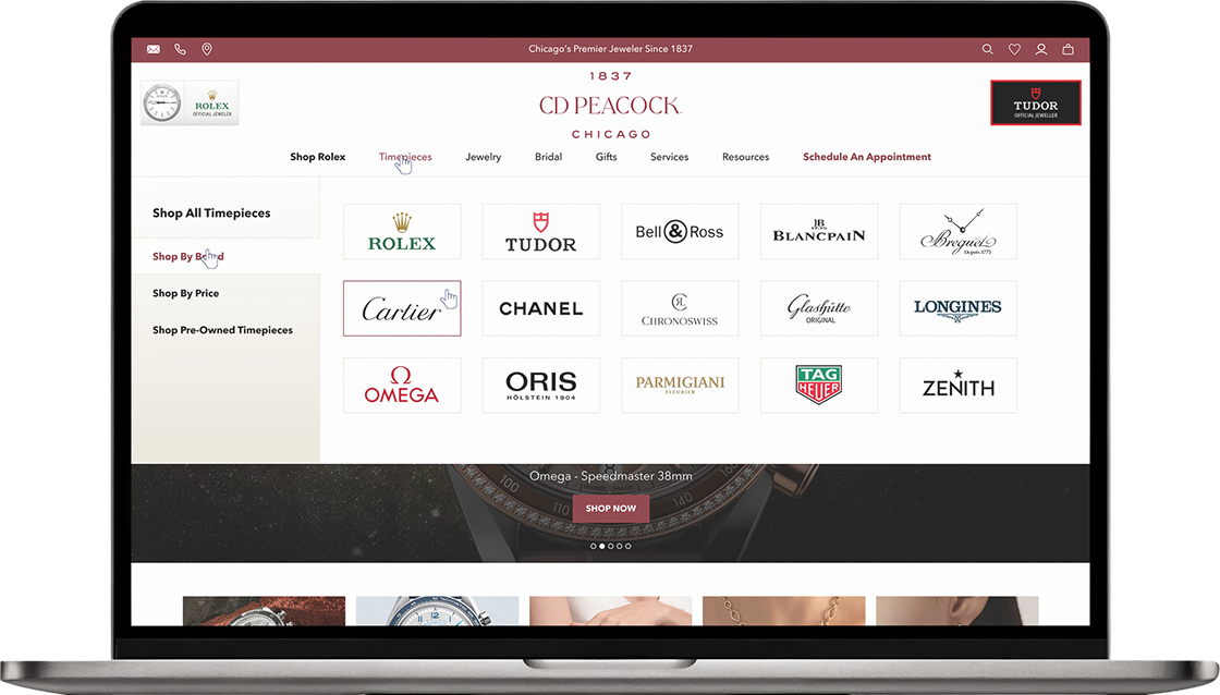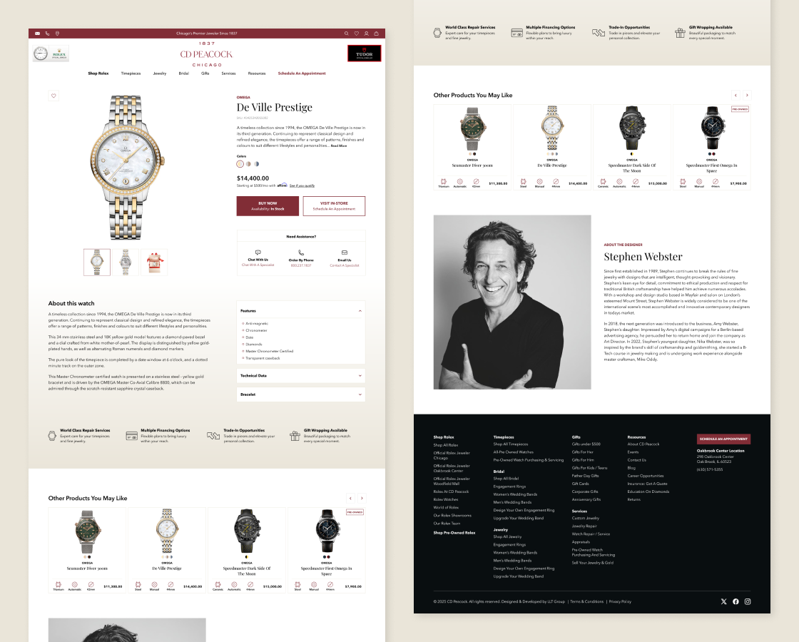 cdpeacock.comCD Peacock is one of Chicago’s most established jewelry and watch retailers, carrying partners like Rolex and Tudor. They had strong products and real brand equity, but a Shopify experience that couldn’t keep pace. We were brought in to fix that, from the ground up.