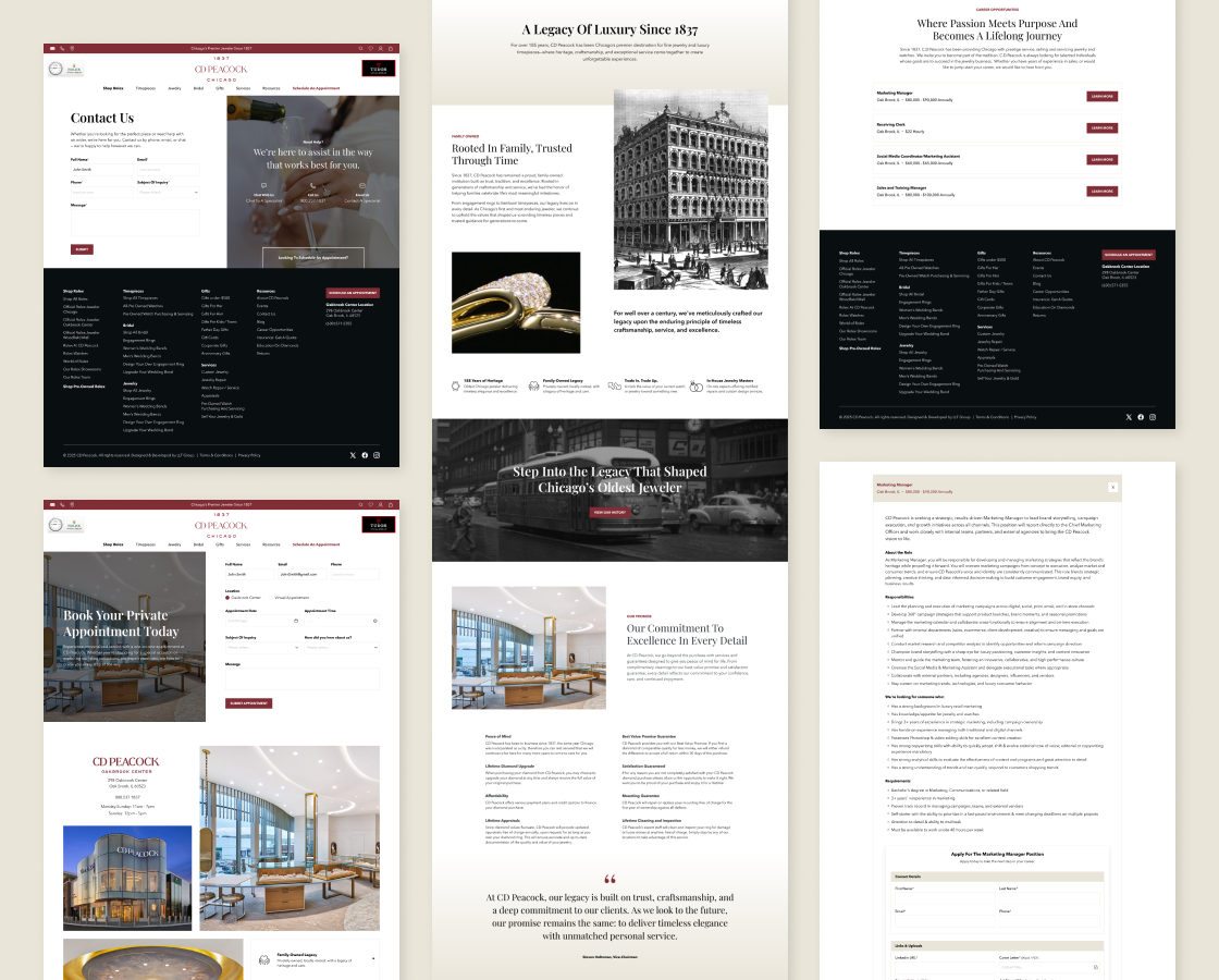 Every touchpoint was elevated to reflect the premium nature of what CD Peacock sells, from scaled imagery and interactive variant selectors to campaign landing templates and advanced appointment forms that give marketing real tools to drive conversions.