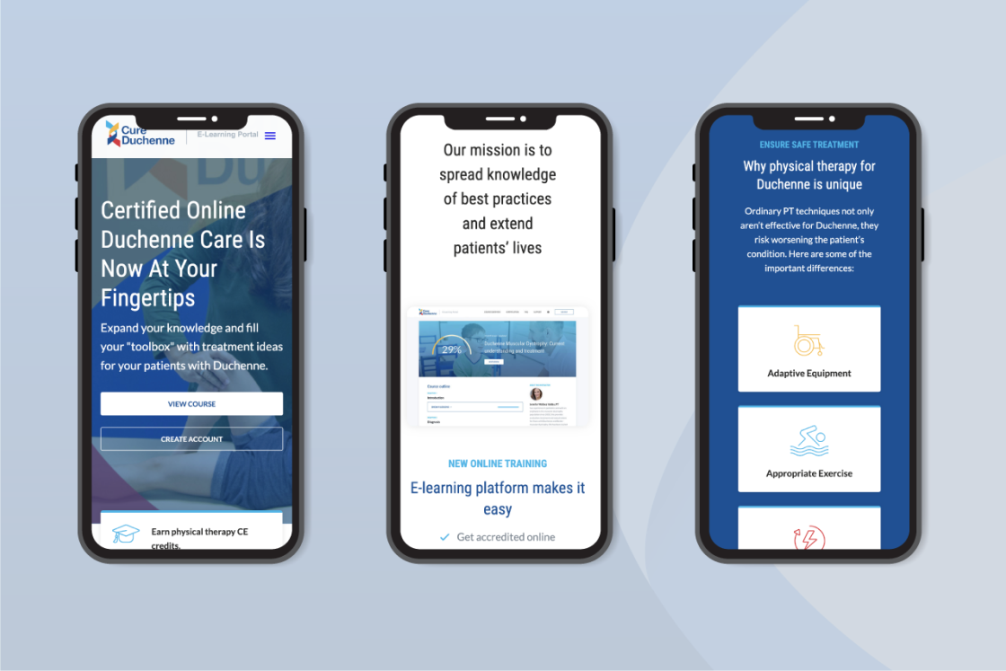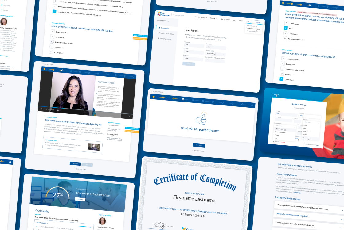CureDuchenne came to us to design and develop a custom e-learning portal to educate physical therapists, as well as a marketing landing page to increase awareness of the course and spur enrollment.