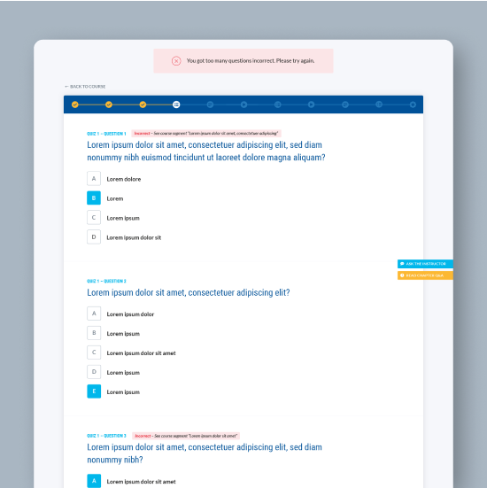 Our task for the e-learning course lesson screens was to use the visual identity established in the landing page and account views and translate it to the functional needs of the course’s content. The layouts included course and chapter summaries, video lessons, FAQs and quizzes, as well as user profile management.
